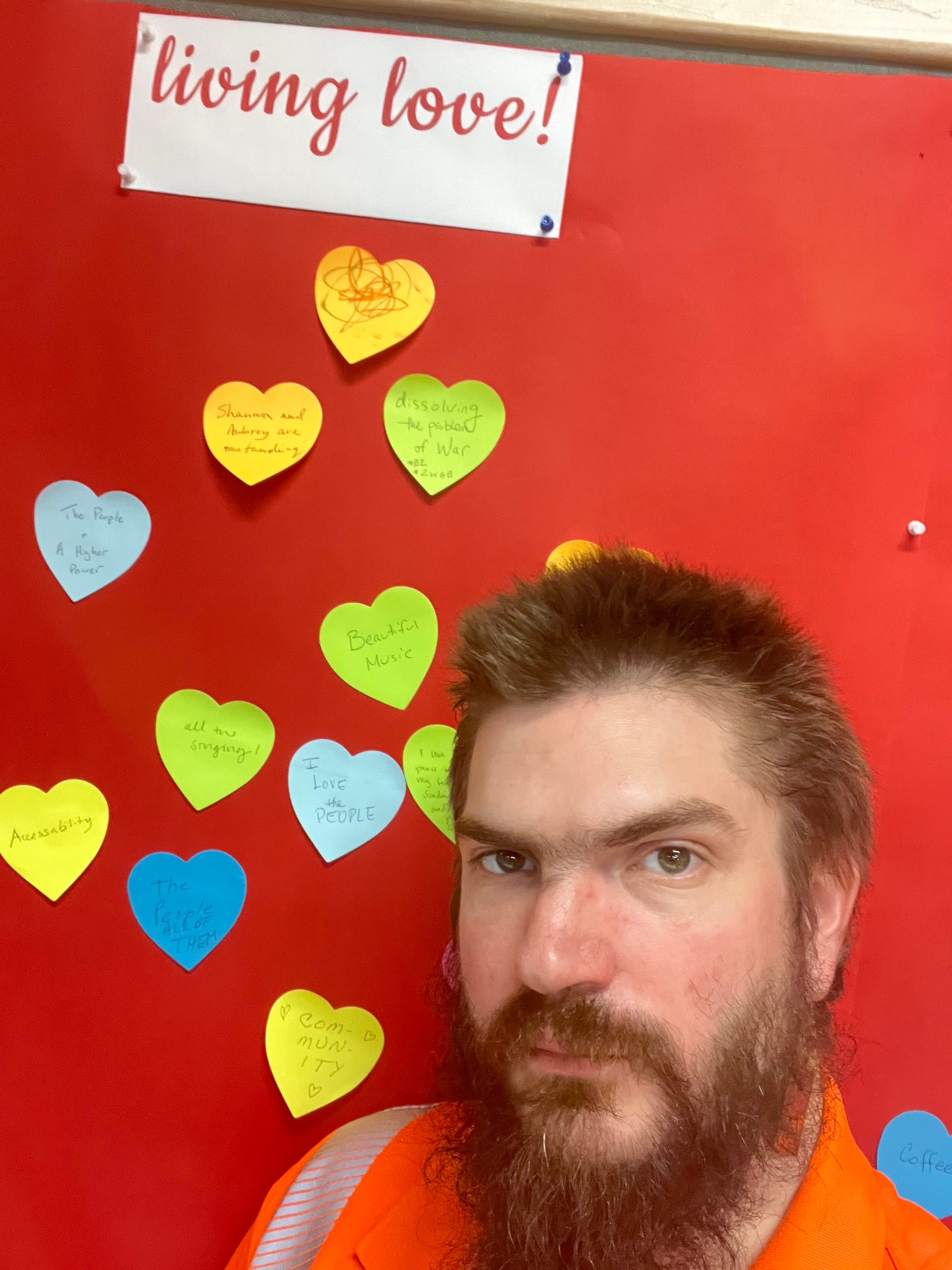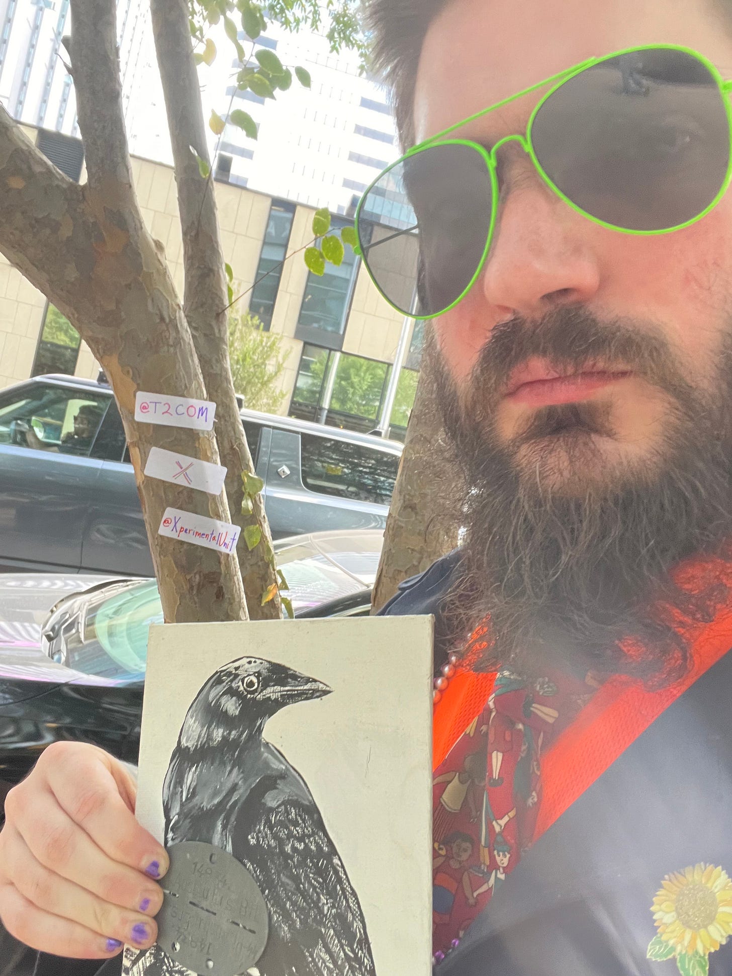 , in this “Living Love” sticker wall at the church.See also me here posing yesterday with my stickers saying “@XperimentalUnit x @T2COM_HQ” along with a painting made for me by an important online friend. We have since had a falling out, but they introduced me to this song, which crucially features the line “repent.”